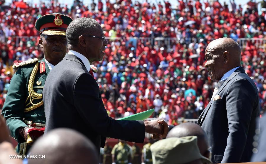 Lesotho's newly-elected Prime Minister Pakalitha Mosisili(C) shakes hands with the outgoing Prime Minister Thomas Thabane during the inauguration ceremony in Maseru, capital of Lesotho, on March 17, 2015. Lesotho's newly-elected Prime Minister Pakalitha Mosisili was inaugurated on Tuesday with a call for unity in the kingdom. (Xinhua/DOC/Elmond Jiyane)