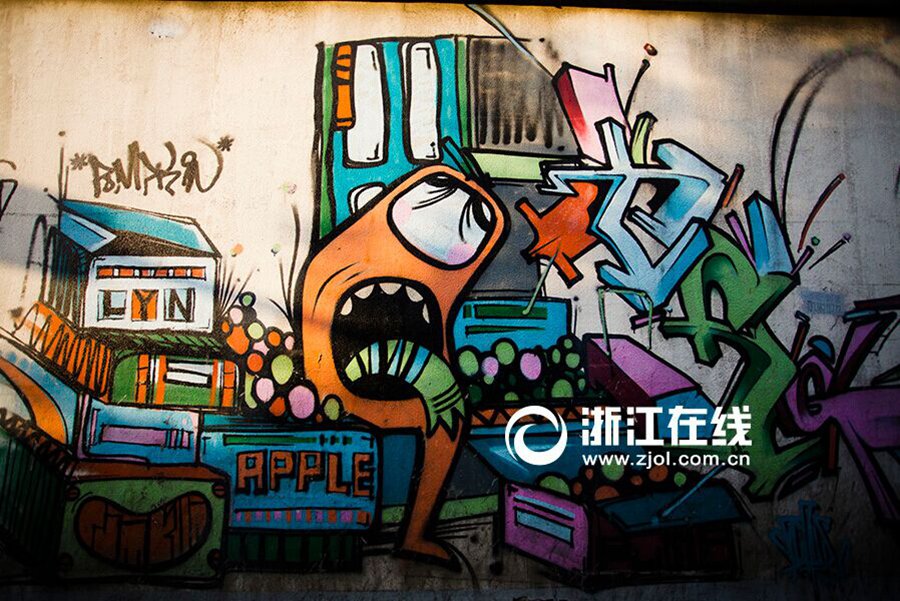 New graffiti on the walls of Youyong Alley in Hangzhou attract pedestrians’ attention and slow their steps down. The color splash on the walls gives people a reason to slow down and enjoy the beauty of life. (Zhejiang Online/Tong Xiaolei)
