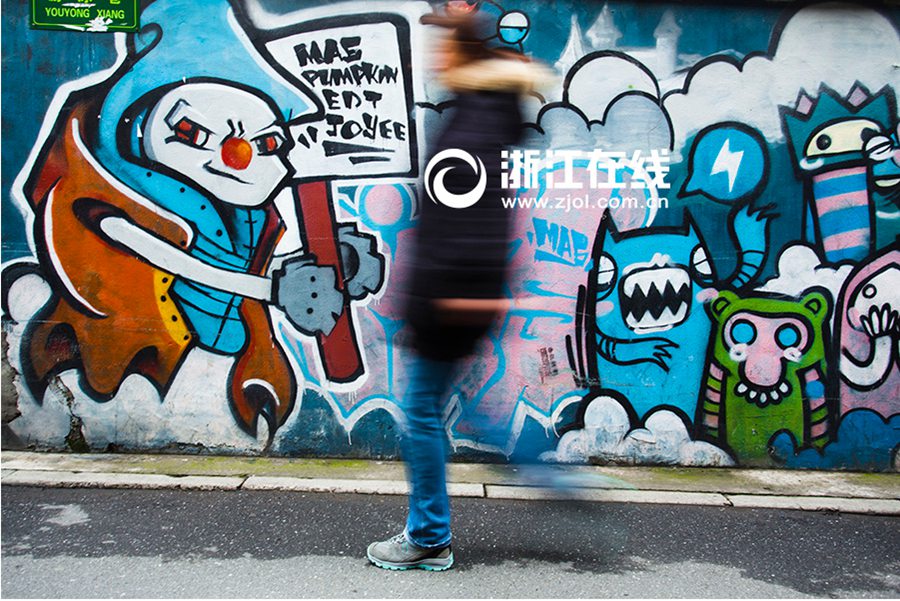 New graffiti on the walls of Youyong Alley in Hangzhou attract pedestrians’ attention and slow their steps down. The color splash on the walls gives people a reason to slow down and enjoy the beauty of life. (Zhejiang Online/Tong Xiaolei)