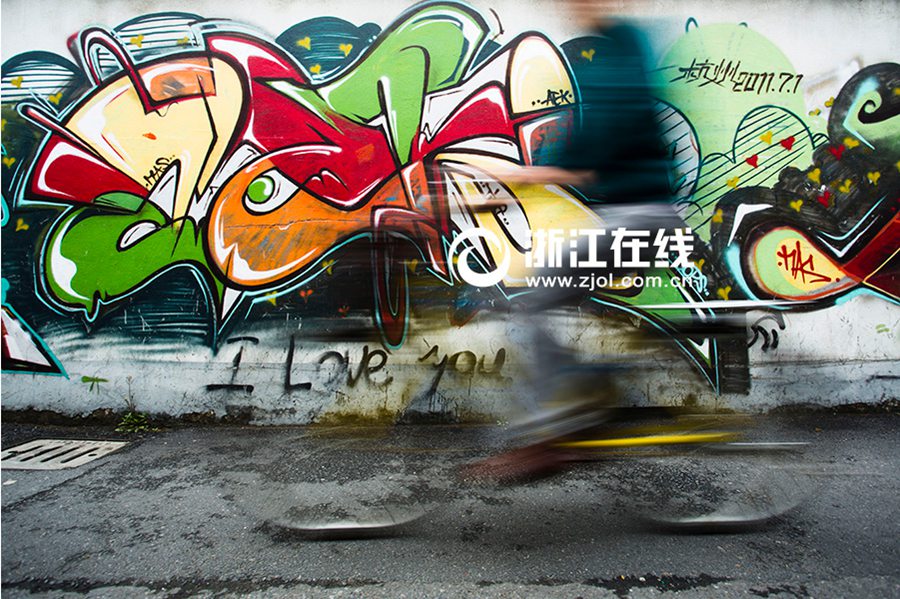 New graffiti on the walls of Youyong Alley in Hangzhou attract pedestrians’ attention and slow their steps down. The color splash on the walls gives people a reason to slow down and enjoy the beauty of life. (Zhejiang Online/Tong Xiaolei)