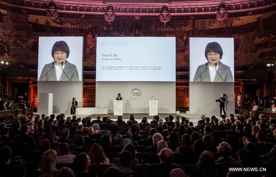 Yi Xie, professor at the University of Science and Technology of China, attends the ceremony of L'Oreal-UNESCO For Women in Science Awards 2015, in Paris, France, March 18, 2015. Yi Xie, professor at the University of Science and Technology of China, was on Wednesday honored with the L'Oreal-UNESCO For Women in Science Awards 2015, together with four other women for their ground-breaking discoveries in physical sciences. (Xinhua/Chen Xiaowei)