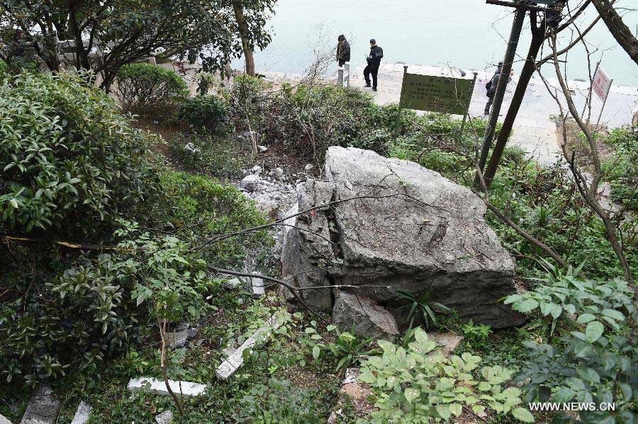 Policemen check the incident site at a scenic spot in Guilin, southwest China's Guangxi Zhuang Autonomous Region, March 19, 2015. Seven people were killed and 19 others, including eight Taiwanese, were injured after a huge boulder fell off a mountain in Guilin Thursday morning. (Xinhua/Zhao Jiazhi)