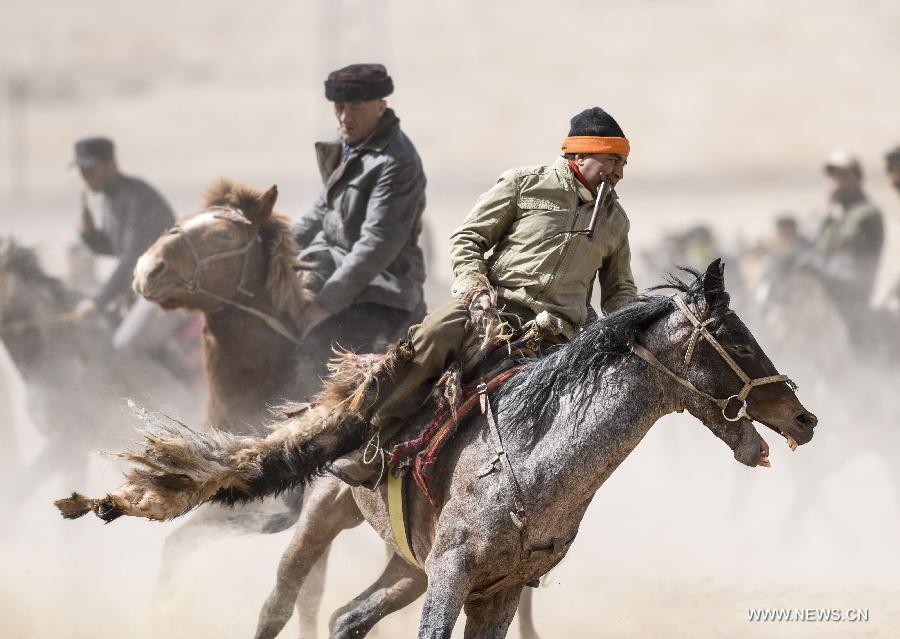 Horsemen of the Tajik ethnic group attend Buzkashi competition in Tizinafu Township of Taxkorgan Tajik Autonomous County, northwest China's Xinjiang Uygur Autonomous Region, March 18, 2015. Buzkashi is a sport for horsemen to compete to drag a goat carcass. (Xinhua/Jiang Wenyao)