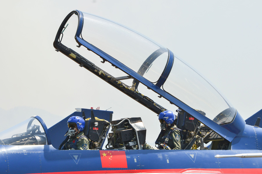 Fighter pilot Yu Xu (first on right) is ready to perform missions in LIMA on March 17, 2015. (Xinhua/Zhang Wenzong)