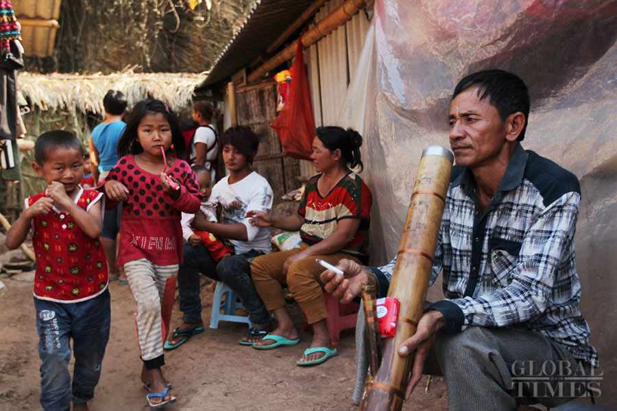Liu Laofang (right), 49, smokes a water pipe in Lincang, Yunnan Province on March 18. His family and neighbors fled to China during the night about one month earlier. They now live in once abandoned shacks and tarpaulin tents in a quarry. (Photo: Cui Meng/GT)
