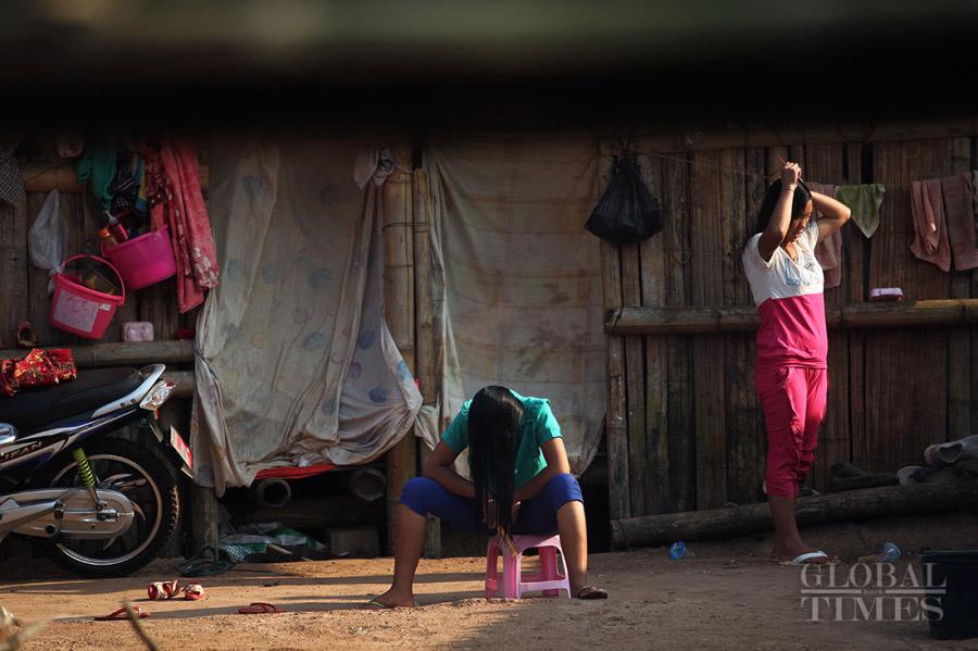 | Two Kokang girls comb their hair outside shelters in Lincang, Yunnan Province on March 18. Many refugees choose to live in abandoned sheds close to relatives rather than in shelters provided by the Chinese government. (Photo: Cui Meng/GT) |