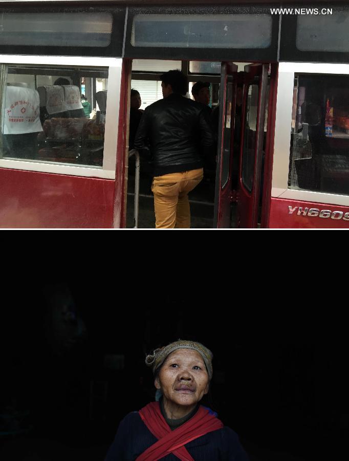 | The combined photo taken on March 9, 2015 shows Meng Jiming (upper) getting on a bus to the coach station in Nongding Village of Bansheng County, south China's Guangxi Zhuang Autonomous Region, and his mother Luo Jinye (lower) standing alone in front of their house. Nongding and Nongchao Villages are located in Bansheng County, a poor rural area of uninhabitable karst topography in Guangxi. After a short family reunion of the spring festival, young people of the two villages left their hometown again. Because of the topography and the weather, both of the two villages are unsuitable for farming. Working in east or south China's modern cities has become a major source of income for many local families and a preference for most young people. After helping their aged parents plant corns, some of them have to leave home at midnight to catch a coach in the countyseat to their faraway working places. (Xinhua/Huang Xiaobang) |