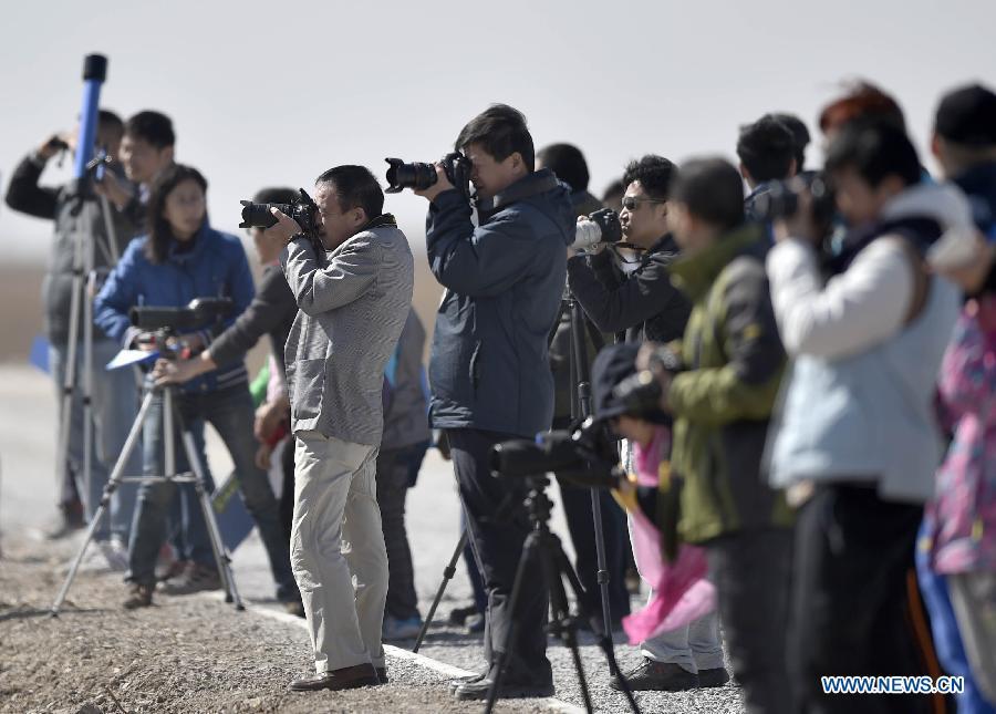 People watch migrant birds at the Beidagang wetland in Tianjin, north China, March 21, 2015. The wetland's administrative staff recorded more than 6,000 migrant birds here, as the weather gets warmer. (Xinhua/Yue Yuewei)