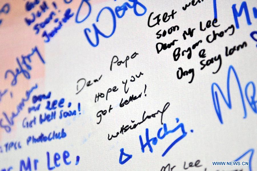| Singpaore's Prime Minister Lee Hsien Loong's message for his father Lee Kuan Yew is seen at Singapore's Tanjong Pagar Community Club on March 22, 2015. Singapore's former prime minister Lee Kuan Yew has weakened further, the Prime Minister's Office (PMO) said on Sunday. (Xinhua/Then Chih Wey) |