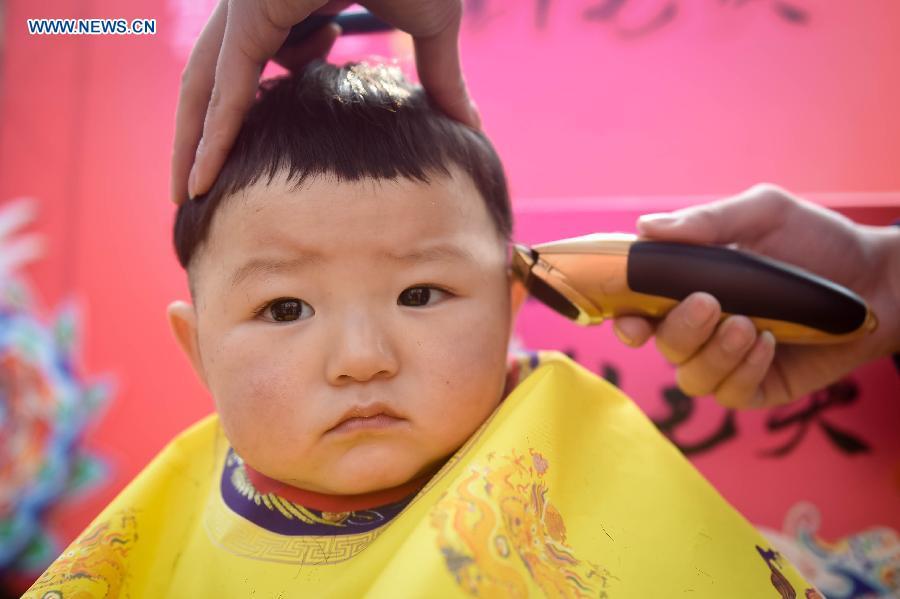 A child has a free haircut in Hefei, capital of east China's Anhui Province, March 21, 2015. March 21 is the second day of the second month in traditional Chinese lunar calendar this year. Folklore addresses it as "dragon lifting head", meaning the spring awakens after winter hibernation, when people usually have a haircut to bring good luck. (Xinhua/Zhang Duan)