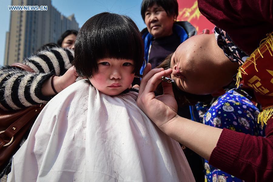 A child has a free haircut in Hefei, capital of east China's Anhui Province, March 21, 2015. March 21 is the second day of the second month in traditional Chinese lunar calendar this year. Folklore addresses it as "dragon lifting head", meaning the spring awakens after winter hibernation, when people usually have a haircut to bring good luck. (Xinhua/Du Yu)