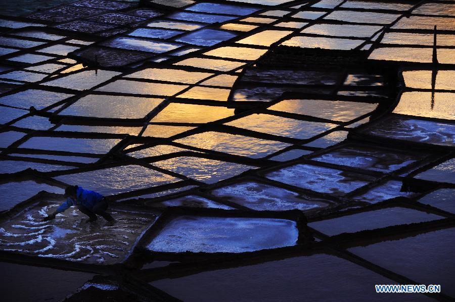 A villager works on salt pans in Markam County, southwest China's Tibet Autonomous Region, March 21, 2015. Markam county, with rich salt resources, has more than 3,000 salt pans to evaporate brine in the sun with an ancestral technique since Tang Dynasty (618-907AD), which is also the oldest method of salt production. This salt evaporation method was listed as one of China's National Intangible Cultural Heritage in 2009. (Xinhua/Wen Tao)