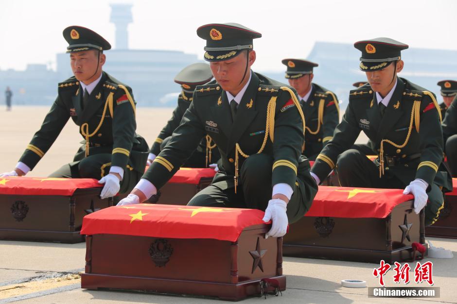 The remains of 68 Chinese soldiers killed in the 1950-1953 Korean War arrive at at Shenyang Taoxian Airport, in northeast China's Liaoning Province on March 20, 2015. The remains were returned by the Republic of Korea on Friday, the second such repatriation following that of 437 Chinese soldiers in 2014. [Photo: Chinanews.com]