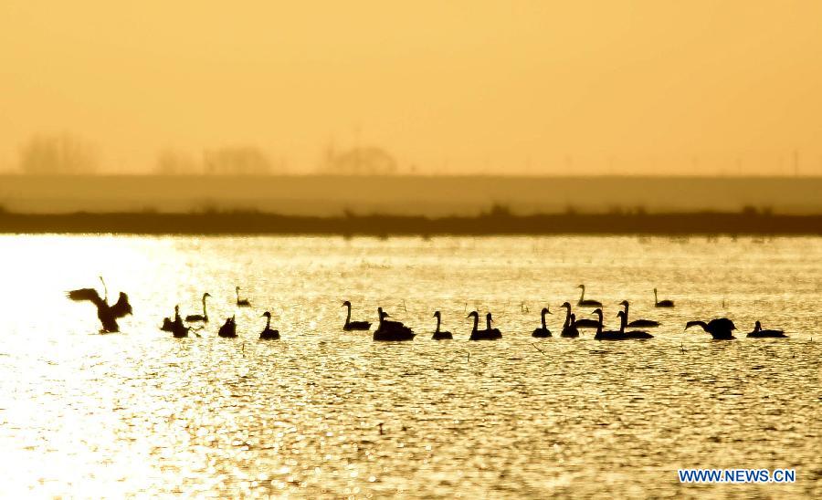Swans search for food on the Yellow River in Dalate Banner, north China's Inner Mongolia Autonomous Region, March 23, 2015. Millions of migratory birds from southern China will rest here for about a month before they migrate to Siberia in Russia. (Xinhua/Ren Junchuan)