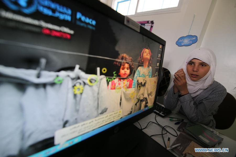 A Palestinian student attends a lesson in a computer laboratory at a UN-run school which is reopened after it was damaged during the war between Israel and Hamas militants in Khuzaa village of the southern Gaza Strip city of Khan Yunis, on March 22, 2015. (Xinhua/Khaled Omar)