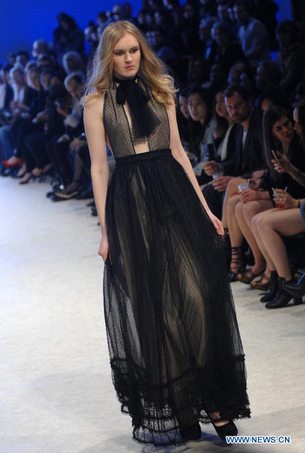 A model presents a creation of Italian designer Rocco Adriano Galluccio during the closing day of Vancouver Fashion Week Fall/Winter 2015 in Vancouver, Canada, on March 22, 2015. (Xinhua/Sergei Bachlakov)