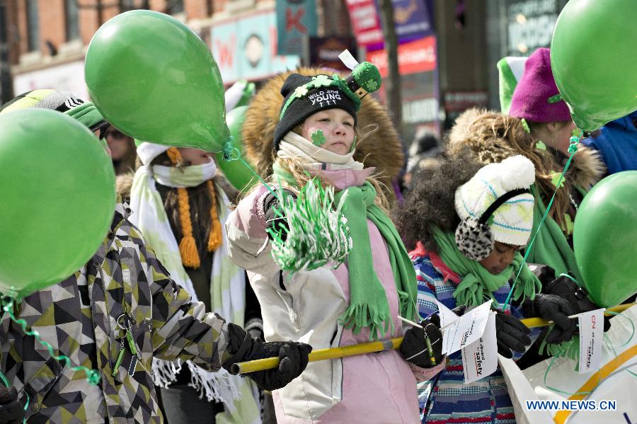 People celebrate the St. Patrick′s Day in downtown Montreal, Canada, March 22, 2015. (Xinhua/Andrew Soong)