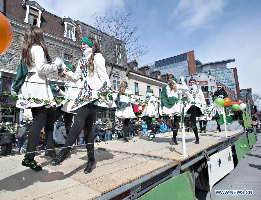 | People celebrate the St. Patrick′s Day in downtown Montreal, Canada, March 22, 2015. (Xinhua/Andrew Soong) |