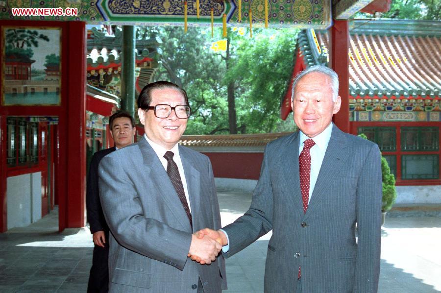File photo taken on May 18, 1993 shows then Chinese President Jiang Zemin (L) meeting with Lee Kuan Yew, in Beijing, capital of China. Lee Kuan Yew, former prime minister of Singapore, died at 3:18 am on March 23, 2015 at the age of 91, according to a statement released by the Prime Minister's Office (PMO). (Xinhua/Ma Juntian)