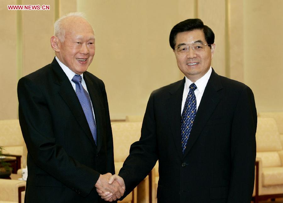 File photo taken on June 19, 2004 shows then Chinese President Hu Jintao (R) meeting with Lee Kuan Yew, in Beijing, capital of China. Lee Kuan Yew, former prime minister of Singapore, died at 3:18 am on March 23, 2015 at the age of 91, according to a statement released by the Prime Minister's Office (PMO). (Xinhua/Yao Dawei)