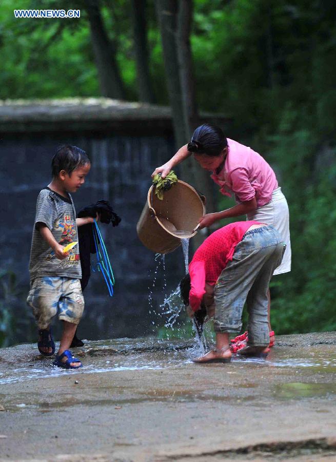 | A student washes hair under the help of classmates at Nongyong Primary School in Bansheng County, south China's Guangxi Zhuang Autonomous Region, June 17, 2014. Nongyong Primary School was built in 1964. It is located in Bansheng County, a rural area of karst topography in Guangxi. Its initial school building consists of 12 one-storey houses. In 1990s, a two-storey teaching building and rough dormitory were built. There are about 250 students from all 22 villages of Nongyong. Every Monday, most of them have to walk over hills on their way to the school. In weekdays, about 30 children share seven or eight beds in a small room less than 20 square meters. Their main source of drinking water is recycle of rainwater. However, rough teaching and living facilities did not change their deep desire for knowledge. Investments and donations across the country brought them new dormitory, canteen, bathroom and library. It offered those children a better condition of learning. (Xinhua/Huang Xiaobang) |