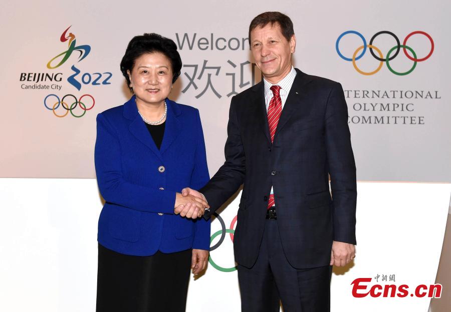 Chinese vice premier Liu Yandong shakes hands with Alexander Zhukov (R), chairman of the IOC evaluation commission and Russian IOC member, at the opening ceremony of the inspection tour of Beijing, which has joined up with Zhangjiakou city in Hebei province to bid to co-host the 2022 Winter Olympics, March 24, 2015. (Photo provided to China News Service)