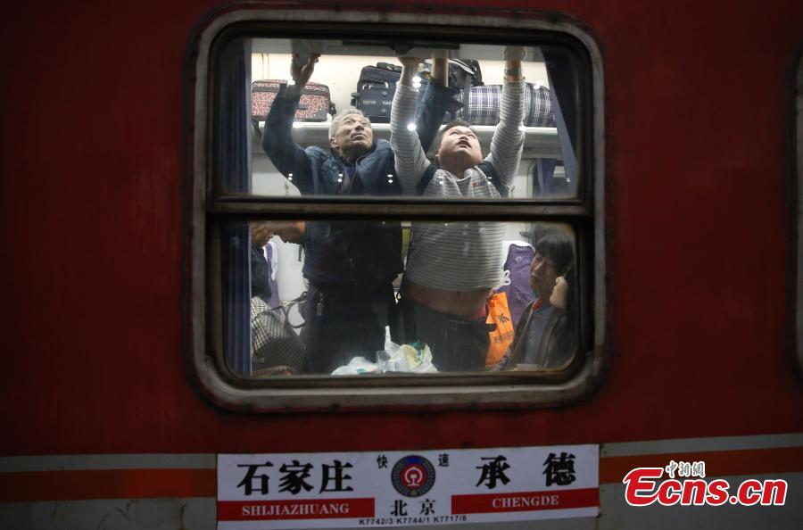 | Passengers take a train on the underground railway line connecting Beijing’s two major railway stations, March 20, 2015. The K7742 train from Shijiazhuang in Hebei province stops at the two stations before arriving at its destination Chengde, also in Hebei province. It takes 15 minutes for the train to travel the underground section, compared with the usual 40 minutes for passengers to transfer between the two stations using other public transport. Most passengers travelling to China's north and northeast have to depart from Beijing Railway Station, while those heading for the south board their trains at Beijing West Railway Station. The completion of the direct line between the two stations also marks the connection of the Beijing-Guangzhou Railway and the Beijing-Harbin Railway, two major railway lines in China. (Photo: China News Service/Liu Guanguan) |