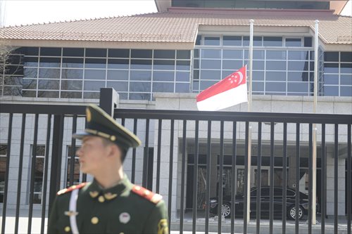The Singaporean flag flies at half-mast to mourn the passing of Lee Kuan Yew at the embassy in Beijing on March 23.
