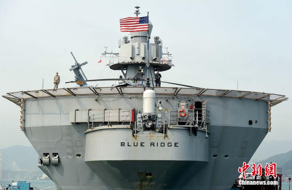 USS Blue Ridge, the command ship of the U.S. Seventh Fleet which anchored in the sea area of the Tsing Ma Bridge in Hong Kong, invites media on board for visit on March 23, 2015. After a six-month maintenance period, the “Blue Ridge” arrived in Hong Kong on March 20. USS Blue Ridge (LCC-19) started service in 1970, and is one of the strongest US Navy command ships. It can cover a battle area up to 124 million square kilometers, 10 times the area of the United States. (CNS/Zhang YU)