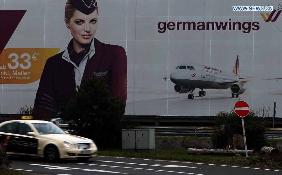 A taxi drives past a poster of Germanwings near its headquarters in Cologne, Germany, on March 24, 2015. There are no Chinese passengers onboard the crashed Germanwings flight 4U9525, "as far as we know today", said Germanwings CEO Thomas Winkelmann on Tuesday. (Xinhua/Luo Huanhuan)