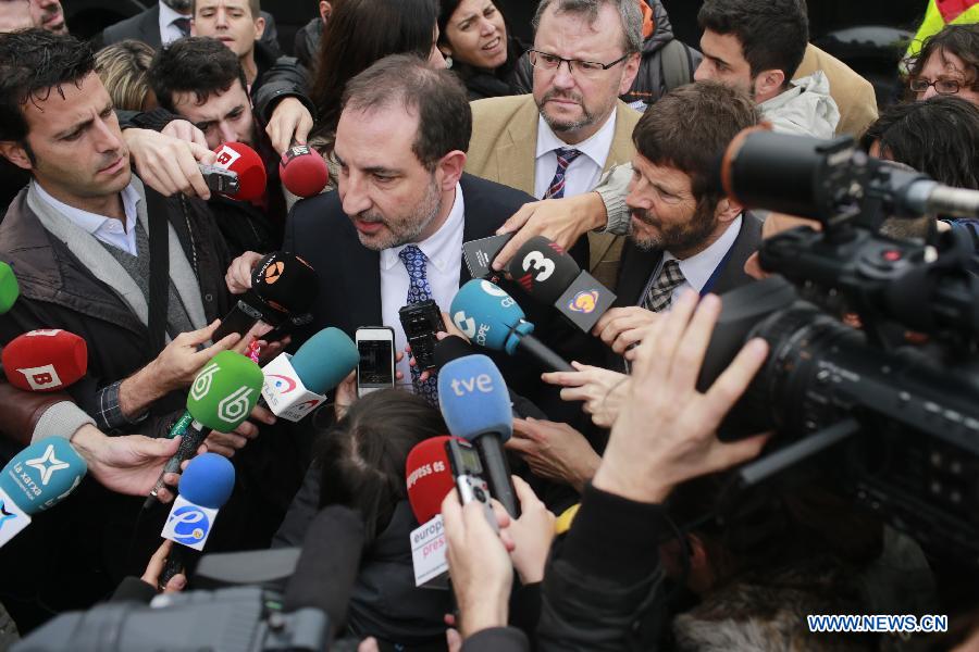 The Catalan Minister of Interior Ramon Espadaler(C) speaks to media at Barcelona's El Prat airport in Barcelona, Spain, on March 24, 2015. An Airbus A320 of the German low-cost airline Germanwings with 150 people on board crashed on Tuesday in southern France, French authorities confirmed. (Xinhua/Pau Barrena)