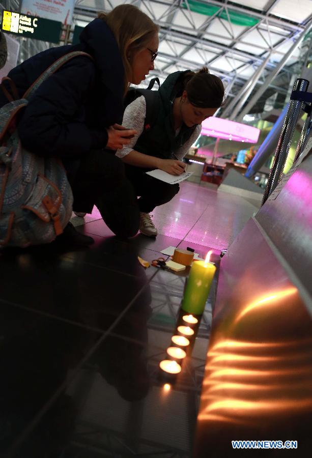 People light candles and write messages to mourn the victims of the crashed plane of Germanwings at the airport in Duesseldorf, Germany, on March 24, 2015. An Airbus A320 of the German low-cost airline Germanwings with 150 people on board crashed on Tuesday in southern France, French authorities confirmed.(Xinhua/Luo Huanhuan)