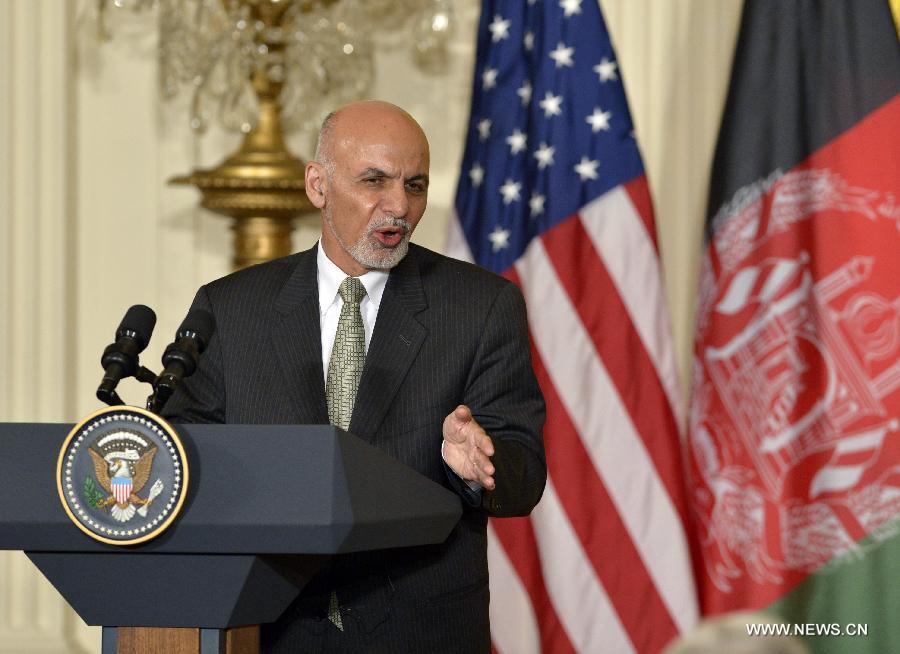 Afghan President Ashraf Ghani speaks at a joint press conference in the East Room of White House in Washington D.C., the United States, March 24, 2015. U.S. President Barack Obama announced Tuesday no drawdown of the current 9,800 U.S. troops stationed in Afghanistan will occur through the end of 2015. (Xinhua/Yin Bogu)