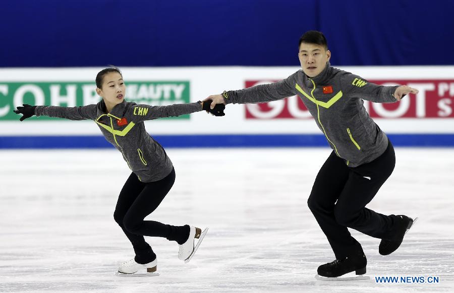 Peng Cheng and Zhang Hao of China take part in their training session before World Figure Skating Championships 2015 at Oriental Sports Center in Shanghai, China on March 24, 2015.(Xinhua/Wang Lili)