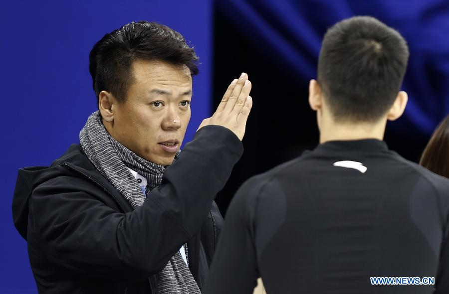 Coach Zhao Hongbo gives instructions to player Han Cong during their training session before World Figure Skating Championships 2015 at Oriental Sports Center in Shanghai, China on March 24, 2015.(Xinhua/Wang Lili)