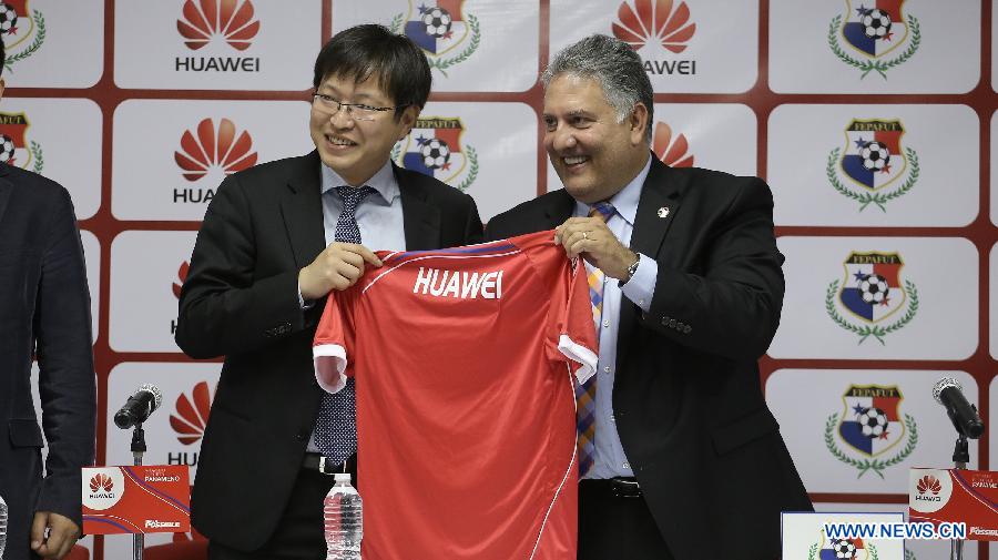 | The CEO of Huawei for Caribbean Office Bruce Guo (L) receives a T-shirt from the President of the Panamanian Federation of Football (FEPAFUT) Pedro Chaluja during a press conference in Panama City, capital of Panama, on March 24, 2015. The Chinese company of Telecommunications Huawei Technologies pledged on Tuesday to sponsor for four years to the football national teams of Panama, and the Panamanian Football League. (Xinhua/Mauricio Valenzuela) |