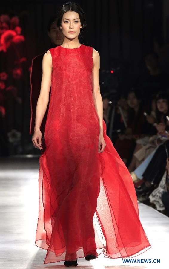 A model presents a creation of Eve de Cina during the China Fashion Week A/W 2015/2016 in Beijing, capital of China, March 24, 2015. (Xinhua/Li Mingfang)