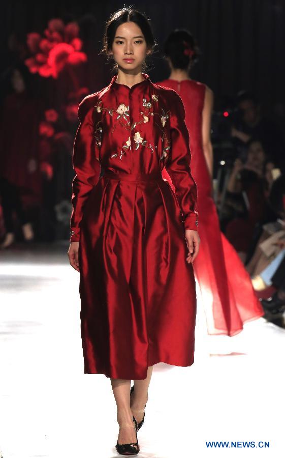 A model presents a creation of Eve de Cina during the China Fashion Week A/W 2015/2016 in Beijing, capital of China, March 24, 2015. (Xinhua/Li Mingfang)
