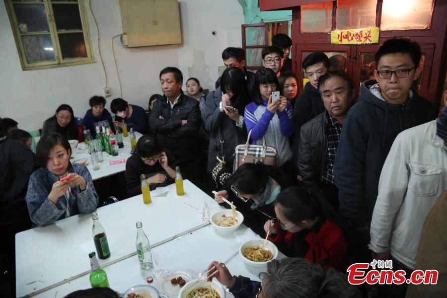 Customers queue to buy noodles in the time-honored Xincheng Noodle House in Qianmen, downtown Beijing, March 24, 2015. The 60-year-old restaurant will close on March 25 due to rocketing rents. It started as a private noodle house and was then nationalized in 1956. Later, it was operated by private owners, featuring the same decor, products and even staff for decades, and has become a mainstay in Qianmen where many historic buildings have been razed in recent years as part of the street's modernization. (Photo: China News Service/Liu Xianguo)