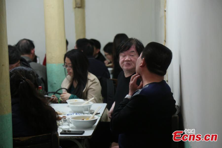 Customers enjoy their noodles in the time-honored Xincheng Noodle House in Qianmen, downtown Beijing, March 24, 2015. The 60-year-old restaurant will close on March 25 due to rocketing rents. It started as a private noodle house and was then nationalized in 1956. Later, it was operated by private owners, featuring the same decor, products and even staff for decades, and has become a mainstay in Qianmen where many historic buildings have been razed in recent years as part of the street's modernization. (Photo: China News Service/Liu Xianguo)