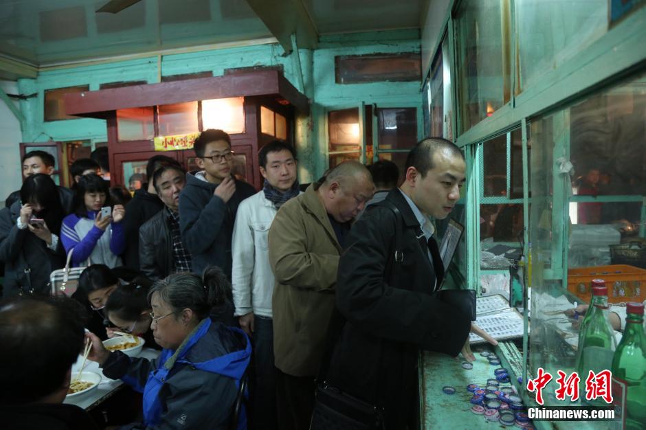 Many old customers stand in line to eat at Xin Cheng Noodle House for the last time, March 24, 2015. (Chinanews/Liu Xianguo)