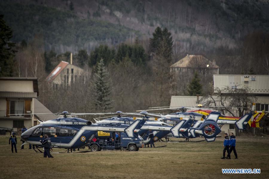 French gendarmes walk in the rescue base camp in the Alps in southern France, March 25, 2015. French gendarmes late Tuesday found one of the two black boxes of the German passenger plane that crashed in southern France with 150 people on board, while a joint international probe into the cause of the accident is under way. (Xinhua/Chen Xiaowei)