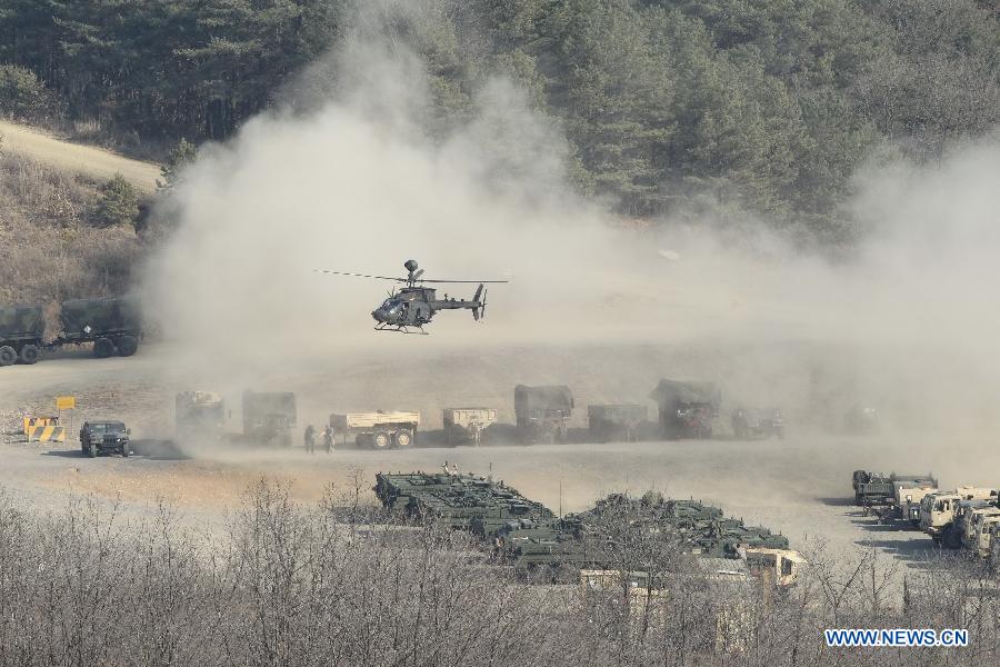 An armored helicopter prepare to land on the ground during the annual joint military exercise Foal Eagle between South Korea and the United States in Pocheon, northeast of Seoul, March 25, 2015. (Xinhua/Seongbin Kang)