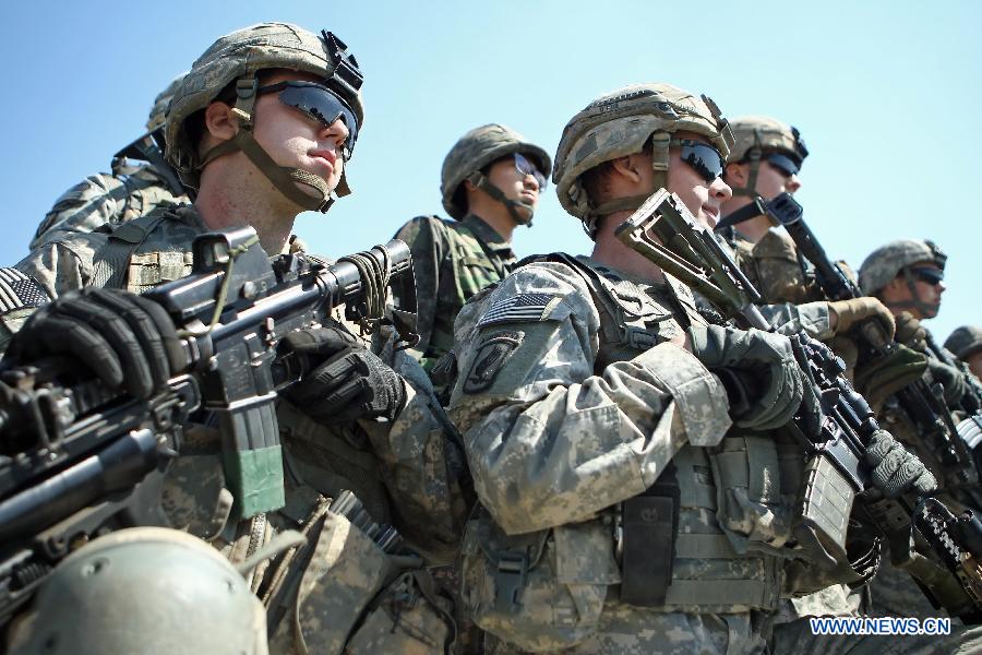 Soldiers attend a briefing during the annual joint military exercise Foal Eagle between South Korea and the United States in Pocheon, northeast of Seoul, March 25, 2015. (Xinhua/Seongbin Kang)
