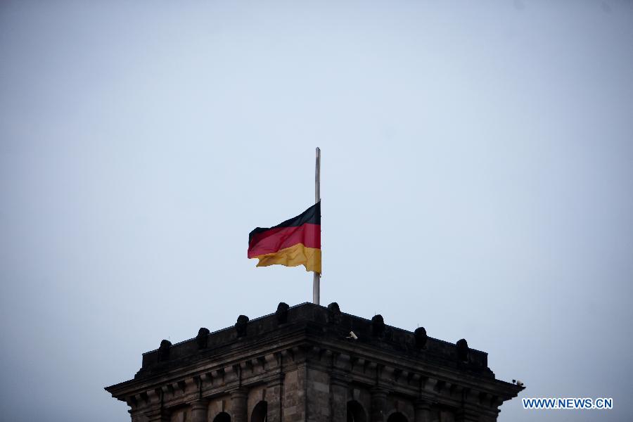 A German national flag flies at half mast on the Reichstag building (the lower house of parliament) to commemorate the victims of the crashed plane of Germanwings in Berlin, Germany, on March 25, 2015. An Airbus A320 of the German low-cost airline Germanwings with 150 people on board crashed on Tuesday in southern France. (Xinhua/Zhang Fan)