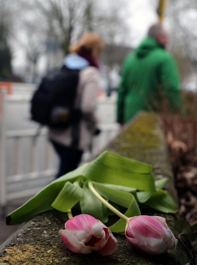 Flowers are laid near Joseph-Koenig High School to mourn victims of the crashed plane of Germanwings in Haltern, westernGermany, March 25, 2015. Sixteen school children and two teachers were among the 150 victims that died in the Germanwings plane crash in the French alps on the way from Barcelona to Duesseldorf. (Xinhua/Luo Huanhuan)