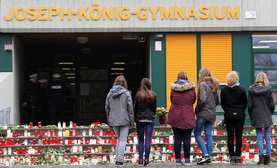 | Students mourn in front of their school in Haltern, western Germany, March 25, 2015. Sixteen school children and two teachers were among the 150 victims that died in the Germanwings plane crash in the French alps on the way from Barcelona to Duesseldorf. (Xinhua/Luo Huanhuan) |