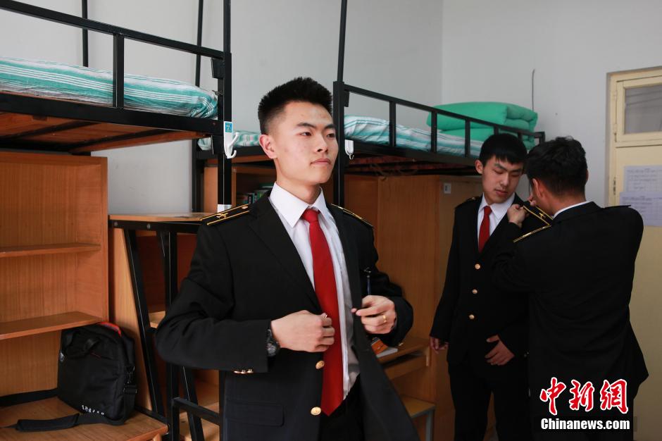 Students of Civil Aviation University of China change new school uniforms on March 24, 2015. The students are from the Flight Techniques College and Cabin Attendant College. (Chinanews/Pang Jie)