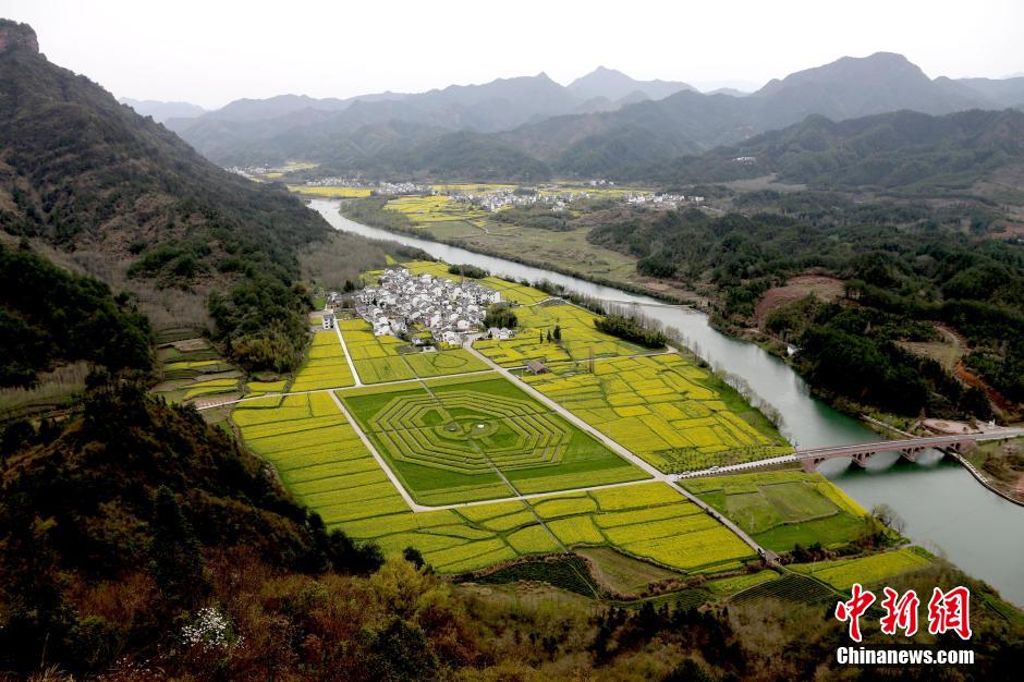 A giant Taiji diagram appears in the rape flower filed in Mount Qiyun in east China's Anhui province on March 24, 2015. (CNS/Shi Guangde)
