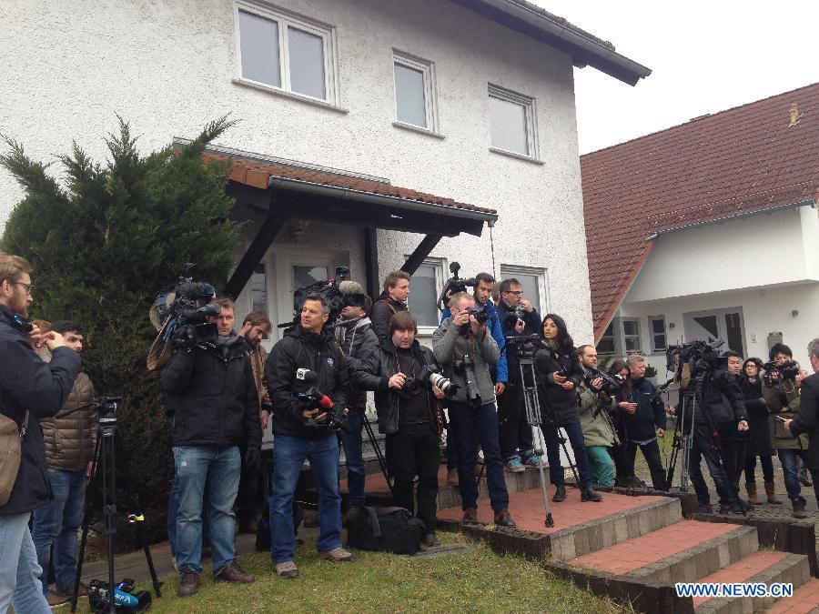 Photo taken by a cellphone on March 26, 2015 shows media workers gathering near Andreas Lubitz's home, the co-pilot who was charged of deliberately crashing Germanwings A320 flight, in Montabaur, western Germany. German police are keeping the Germanwings' co-pilot's home in the town of Montabaur, about 100 km northwest of Frankfurt, under surveillance. (Xinhua/Shen Zhengning)